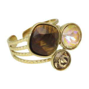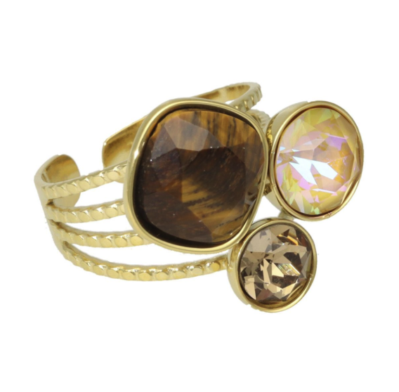 Deze ring heeft schitterende Swarovski kristallen en een tijgeroog edelsteen. De ring is super leuk te combineren met onze andere ringen. De ring is gemaakt van stainless steel, is waterproof en verkleurt niet!