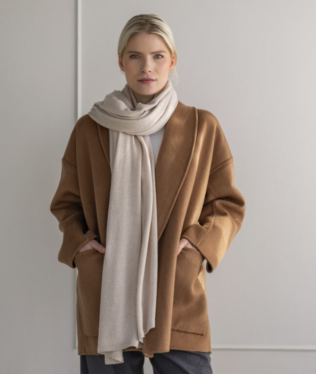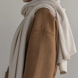 Sjaal Cosy Chic Light Sand. Cosy staat voor zacht en warm en dat is deze sjaal dan ook precies. De sjaal is zacht door dat beetje cashmere en warm door de merino wol. Een heerlijke comfortabele sjaal die verslavend lekker is en door het grote formaat ook fijn als omslagdoek te dragen is. Deze sjaal valt als een chique sjaal die perfect gaat naar een zakelijke meeting, een diner, maar is ook een uitkomst op de bank en achter je PC. Deze sjaal is zowel in het voor- en najaar als in de winter een topsjaal. Daarbij is de sjaal heerlijk ruim van formaat.