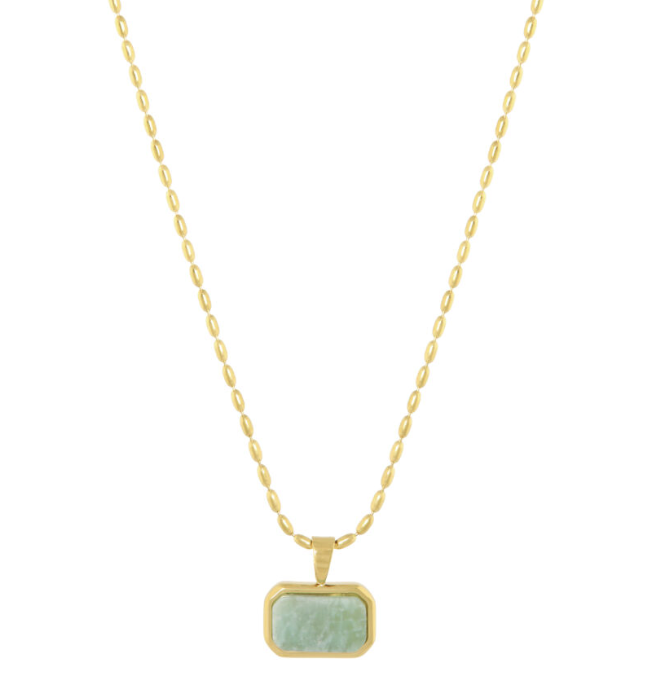 Prachtige vergulde ketting met rechthoek gemstone hanger van amazoniet. De afmetingen van de hanger zijn 0.7 x 1.2 cm. De lengte van de ketting is 16 inch (40cm) met een verleng-kettinkje van 5 cm.