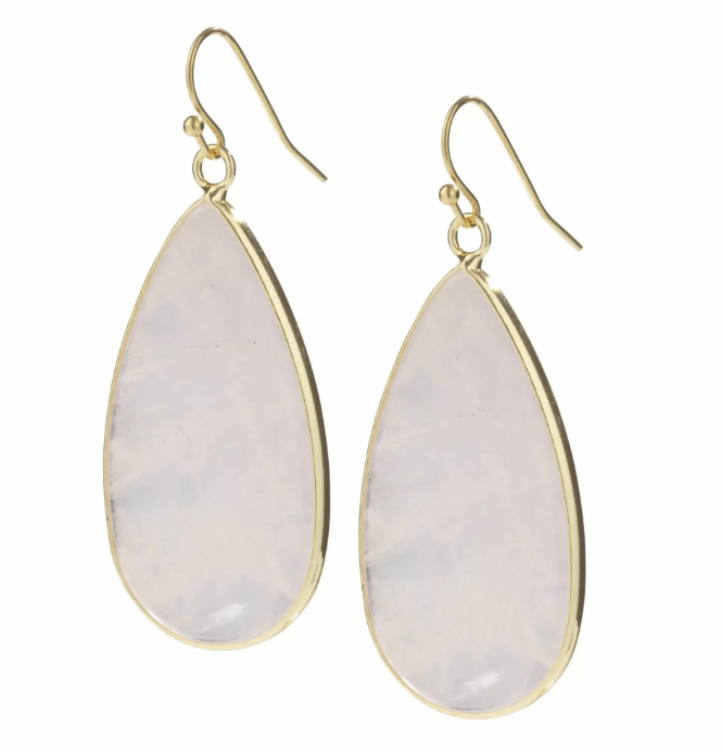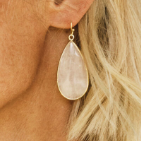 Vergulde oorbellen met pegels van licht roze rozenkwarts. Deze oorbellen hebben een lengte van 4 cm.