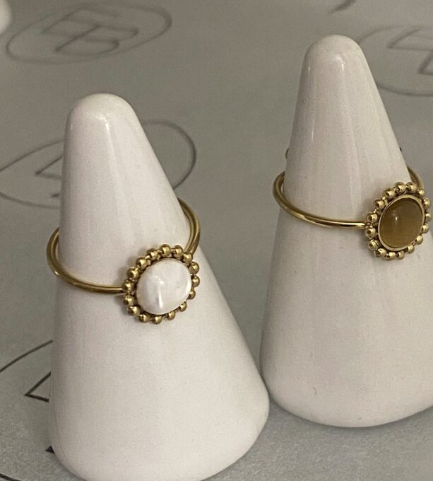 Fijn verguld vintage ringetje met een gemstone of parelmoer. Kies olijfgeel of witte parelmoer.Het ringetje is re-sizable zodat het altijd past.