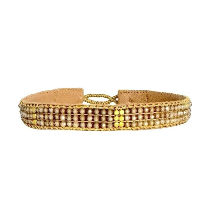 Een combinatie van halfedelstenen, gouden kralen en een messing knoop met 14-karaats goudlaag.